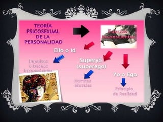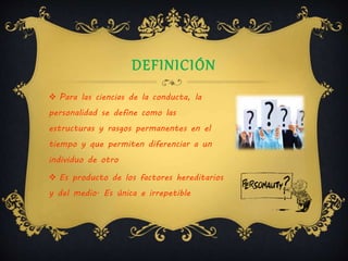 La personalidad se define como los rasgos y estructuras permanentes que diferencian a los individuos, influenciada por factores hereditarios y ambientales. Se exploran diversas teorías, incluyendo la psicosexual de Freud, que destaca la interacción entre el ello, el ego y el superyó, así como la teoría de los rasgos que identifica cinco dimensiones fundamentales. Además, la teoría psicosocial de Erikson describe el desarrollo de la personalidad a través de etapas que implican desafíos y logros específicos a lo largo de la vida.