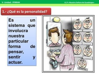 La personalidad es un sistema que involucra nuestra forma particular de pensar, sentir y actuar. Tiene dos componentes: el temperamento, que son rasgos heredados relacionados al desarrollo nervioso, y el carácter, que regula los impulsos del temperamento mediante aspectos éticos y volitivos. Según la teoría de Jung, la personalidad se orienta hacia el mundo exterior de manera espontánea en las personas extrovertidas, mientras que en las introvertidas se orienta hacia adentro de manera menos espontánea y más creativa.