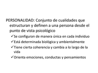 La personalidad está determinada por factores biológicos y ambientales. Se compone de rasgos que orientan las emociones, conductas y pensamientos de una persona de manera única y que pueden cambiar a lo largo de la vida. Existen varias teorías sobre el desarrollo de la personalidad, como la teoría de los rasgos que analiza cómo ciertas características psicológicas definen la conducta de una persona, y la teoría de los cinco grandes factores que describe la personalidad en términos de neuroticismo, extraversión,