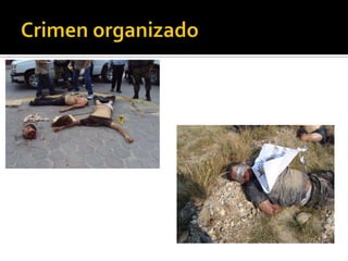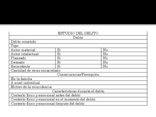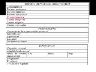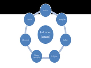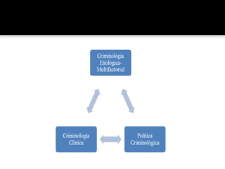 El documento proporciona información sobre varios temas criminológicos. Explica conceptos como lo normal y anormal, la desviación, la conducta anormal y factores criminógenos como los endógenos y exógenos. También describe factores de riesgo como la edad, el sexo y daños cerebrales. Además, analiza el impacto de factores ambientales como la familia, la economía, la educación y la migración en la conducta antisocial.