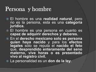 La personalidad y capacidad jurídica se refieren a la capacidad de una persona u organización para adquirir derechos y obligaciones de acuerdo con la ley. Solo las personas nacidas son consideradas personas y solo adquieren derechos una vez nacidas. Las personas pueden ser físicas u organizaciones morales, y ambas tienen atributos como nombre, domicilio y patrimonio.