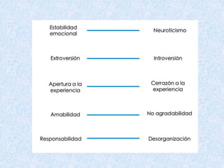 Este documento presenta un resumen de varias teorías de la personalidad. Brevemente describe las teorías psicoanalíticas de Freud y Jung, la teoría humanista de Carl Rogers, y las teorías de los rasgos de Raymond Cattell, Gordon Allport y Hans Eysenck. Define la personalidad y explica conceptos como temperamento, carácter, mecanismos de defensa y perfiles de actitud.