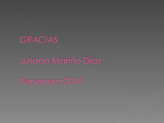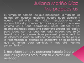 La candidata propone mejorar los derechos de los estudiantes y la calidad de la educación a través de varias iniciativas como jornadas lúdicas, campañas de reciclaje y aseo, mejorar la enfermería escolar, celebrar fechas especiales, y establecer un buzón de sugerencias para escuchar a los estudiantes. Busca representar a la institución como reina del festival del bambuco y mejorar las instalaciones del colegio.