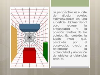 El documento describe tres tipos de perspectiva utilizados en el diseño de interiores: la perspectiva cónica donde todas las líneas de proyección parten de un punto, la perspectiva axonométrica que representa elementos geométricos manteniendo sus proporciones en las tres dimensiones mediante proyección ortogonal, y la perspectiva como ilusión visual que ayuda a determinar la profundidad y ubicación de objetos.