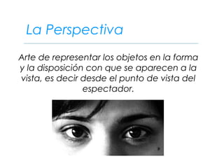 Este documento describe conceptos de perspectiva, angulación y figuras geométricas. Explica que la perspectiva crea sensación de profundidad representando tamaños de objetos según su distancia. Describe cuatro tipos de angulación de cámara y sus efectos. Finalmente, analiza los contornos básicos - cuadrado, círculo y triángulo - y los significados asociados a cada uno.
