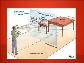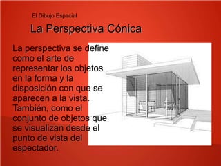 El documento describe los principios básicos de la perspectiva cónica, incluyendo la definición de perspectiva como la representación de objetos desde el punto de vista del espectador, y los diferentes tipos de perspectiva según la posición del espectador. Además, define los elementos clave de la perspectiva como los diferentes planos, líneas y puntos necesarios para crear la ilusión de profundidad en un dibujo.