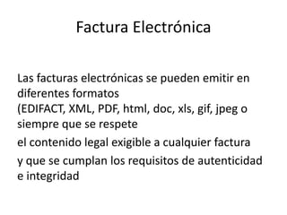 La facturación electrónica consiste en la transmisión de facturas entre emisor y receptor por medios electrónicos con la misma validez legal que las facturas en papel. Las facturas electrónicas pueden emitirse en diferentes formatos siempre que respeten los requisitos legales. Los pagos móviles ofrecen conveniencia pero plantean desafíos de seguridad debido a que la información personal se almacena en dispositivos portátiles.