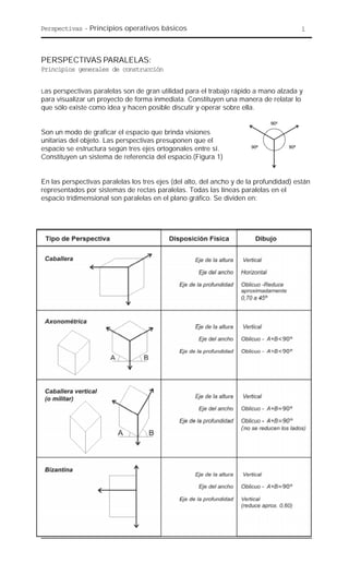 Este documento presenta los principios básicos para construir perspectivas paralelas y cónicas. Explica cómo representar objetos tridimensionales en estas perspectivas, incluyendo cómo medir la profundidad y dibujar formas como cubos y círculos. Describe métodos para encontrar puntos clave en estas formas usando líneas de fuga, medidores y trazados auxiliares, tanto en perspectivas paralelas como cónicas con uno o dos puntos de fuga.
