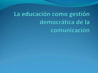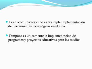 La educomunicación no es simplemente la implementación de herramientas tecnológicas en el aula o la creación de programas educativos para los medios, sino que involucra a varios actores como maestros, periodistas, ministerios de educación y cultura. La educomunicación busca la igualdad, participación y democracia en las relaciones y representa un objetivo ideal para los educadores, aunque las jerarquías institucionales también plantean desafíos. La perspectiva de la educomunicación es un campo independiente donde las