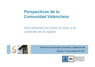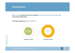 El documento presenta un análisis sobre las perspectivas de la Comunidad Valenciana, enfocando en la identificación de valores estratégicos para su futuro, tales como la industria, la investigación y desarrollo, y el clima. También aborda tendencias externas que afectan a la región, incluyendo el envejecimiento de la población y un consumo más responsable. Se concluye que es necesario adaptar el modelo actual considerando las necesidades de las personas y aprovechar los recursos existentes.