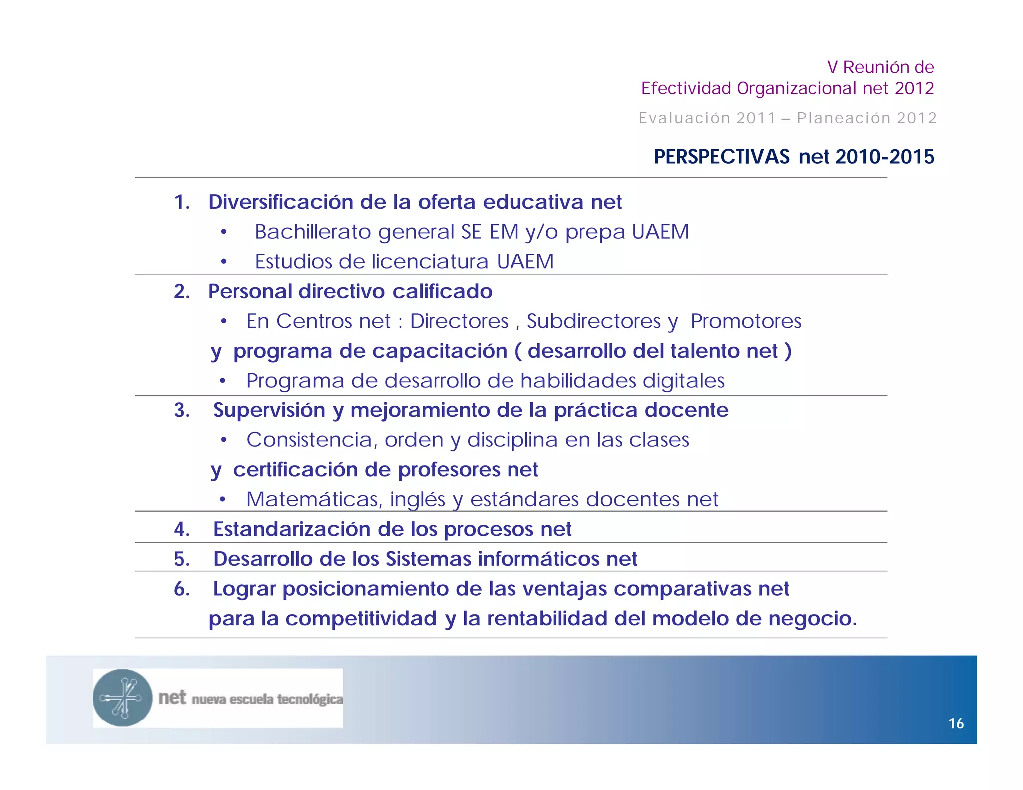 La reunión evaluó el desempeño de 2011 y planificó objetivos para 2012 de la organización net. Las perspectivas para 2010-2015 incluyen diversificar la oferta educativa, contratar personal directivo calificado, supervisar y mejorar la práctica docente, estandarizar procesos, desarrollar sistemas informáticos, y posicionar las ventajas comparativas de net para aumentar la competitividad y rentabilidad.