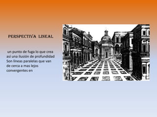 El documento describe diferentes tipos de perspectivas utilizadas en dibujo técnico y arte, incluyendo la perspectiva lineal, aérea, paralela, oblicua, invertida, de importancia, axonométrica, caballera, cónica, isométrica, militar, din, dimetrica, trimétrica y ortogonal. Cada perspectiva crea una ilusión diferente de profundidad u orientación utilizando puntos de fuga y ángulos variables entre los ejes.