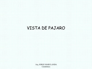 El documento presenta diferentes métodos para crear perspectivas arquitectónicas exteriores e interiores, incluyendo vistas desde pájaro y hormiga, uso de puntos de fuga y plantas, líneas de altura, y definición y aplicación de sombras en perspectivas. Explica conceptos como ángulos de inclinación de la luz, sombras propias, proyectadas y zonas de penumbra. Finalmente, muestra cómo aplicar sombras en una perspectiva arquitectónica.