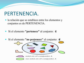 Este documento describe la relación de pertenencia y la relación de inclusión entre elementos y conjuntos. La relación de pertenencia se da entre elementos y conjuntos, y se indica con los símbolos ∈ para pertenece y ∉ para no pertenece. La relación de inclusión se da entre conjuntos y subconjuntos, y se indica con los símbolos ⊂ para está incluido y ⊄ para no está incluido.