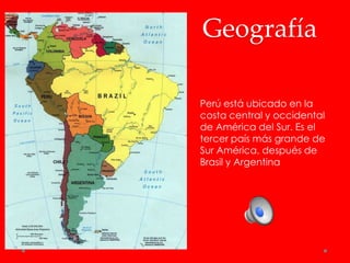 Este documento describe la geografía, población, historia, festivales, arte, música, comida, tradiciones y deportes del Perú. El Perú está ubicado en la costa oeste de Sudamérica y tiene una población de 30 millones de habitantes compuesta principalmente por amerindios, mestizos y europeos. La historia del Perú incluye culturas pre-incaicas, el Imperio Inca y la conquista española. El festival más popular es el Inti Raymi que celebra el sol y los orígenes incas.
