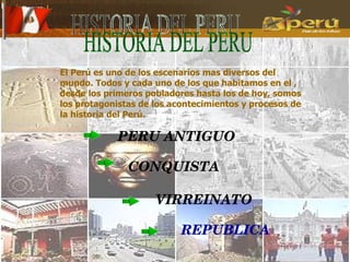 El documento resume la historia del Perú desde las primeras culturas como Paracas, Chavín, Nazca y Mochica hasta la época del Imperio Inca. Luego describe la conquista española y el establecimiento del Virreinato. Más adelante habla sobre la independencia del Perú y su primera época republicana, así como sobre su historia reciente en el siglo XX.