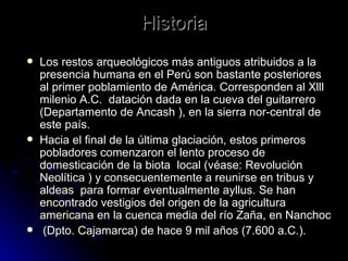 El documento resume brevemente la historia, geografía, gente, lengua, costumbres, religión, sistema político y economía del Perú. La historia del Perú se remonta a hace 13,000 años cuando los primeros humanos poblaron la región. Geográficamente, el país se encuentra en la costa occidental de Sudamérica y está determinado por la interacción de las placas tectónicas Nazca y Sudamericana. La mayoría de la población es católica y habla español aunque existen lenguas indígenas.