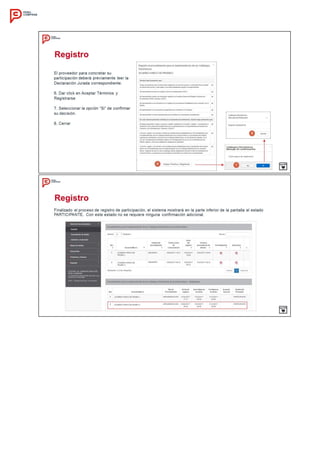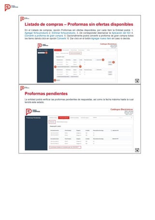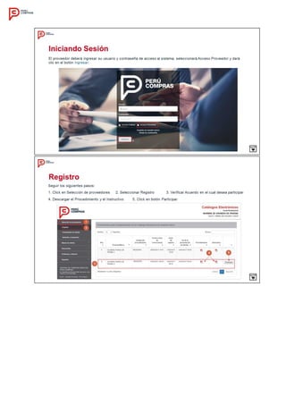 Este documento establece el procedimiento para la implementación de Catálogos Electrónicos de Acuerdos Marco en Perú Compras. Define las generalidades como la base legal aplicable, los catálogos relevantes y la vigencia de un año. Describe el desarrollo del procedimiento incluyendo el cronograma con fechas para registro de ofertas, evaluación y suscripción de acuerdos, así como los requisitos para la participación de proveedores.