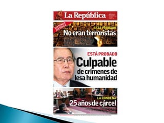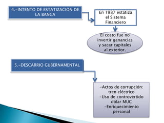 El documento resume el contexto político y económico del Perú entre 1980 y inicios del siglo XXI, incluyendo los gobiernos de Belaunde Terry, García Pérez, Fujimori y Toledo. Durante este periodo, el país enfrentó altos niveles de inflación, deuda externa, terrorismo y corrupción, mientras que los gobiernos implementaron políticas neoliberales y de ajuste estructural. Las Fuerzas Armadas y la Policía Nacional brindaron apoyo humanitario durante desastres y promovieron programas