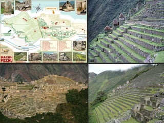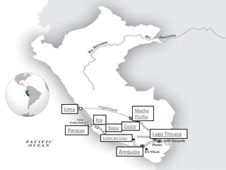 Este documento presenta una ruta de 10 días que comienza en Lima y visita varios lugares notables de Perú como Paracas, Ica, Nazca, el Cañón del Colca, Arequipa, el Lago Titicaca, Cusco y la famosa atracción de Machu Picchu antes de regresar a Lima, detallando brevemente los principales puntos de interés en cada ciudad.