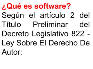El documento discute si la protección jurídica del software en el Perú se basa en los derechos de autor o en las patentes. Explica que el software se considera una obra protegida por el derecho de autor según la Ley Sobre El Derecho De Autor. Específicamente, en el artículo 5 inciso k) de esta ley, el software se menciona como una obra protegida. Por lo tanto, en el Perú el software recibe protección jurídica como una obra sujeta a derechos de autor.