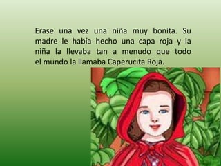 Caperucita Roja debe llevar pasteles a la casa de su abuela a través del bosque. En el camino se encuentra con el lobo, quien engaña a la abuela y se come a Caperucita. Un cazador mata al lobo y rescata a la abuela y Caperucita. Caperucita aprende la lección de no hablar con extraños.