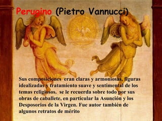 Pietro Vannucci, conocido como Perugino, fue un pintor italiano que vivió entre 1445 y 1523. Trabajó principalmente en Perugia, donde tuvo un próspero taller. Sus composiciones se caracterizaron por ser claras y armoniosas, con figuras idealizadas y un tratamiento suave de temas religiosos. Algunas de sus obras más conocidas incluyen La Asunción, Los Desposorios de la Virgen y varios retratos.