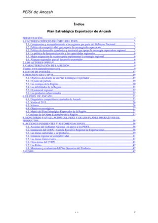 Este documento presenta el Plan Estratégico Regional de Exportaciones (PERX) de Ancash para el período 2004-2013. Incluye un diagnóstico de la situación económica y exportadora de la región, así como sus fortalezas y debilidades. Se identifican productos con potencial exportador como la alcachofa y la concha de abanico. El plan incluye una visión, objetivos y estrategias para impulsar las exportaciones regionales con el apoyo de actores públicos y privados. Finalmente, se recomienda que el gobierno