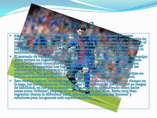 FIFA 13 se centra en mejorar el control del balón y las animaciones de los jugadores. Los rivales controlados por la consola serán más inteligentes en sus decisiones. PES 2013 mejora el primer toque y la individualidad de los jugadores para reconocer sus estilos. Los disparos y pases serán totalmente manuales y los porteros tendrán saques más precisos. Ambos juegos buscan una mayor emersión con sonidos relacionados al desarrollo del partido.