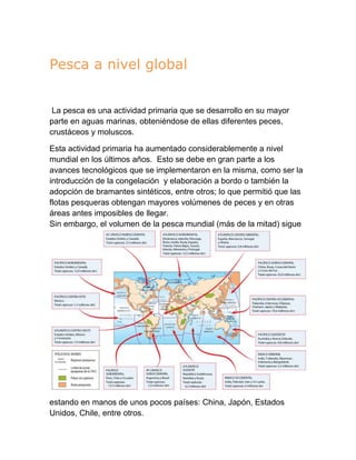 La pesca es una actividad primaria que ha aumentado a nivel mundial debido a avances tecnológicos. La mayor parte de la producción proviene de la pesca marítima, realizada principalmente por unos pocos países líderes. Los lugares de pesca dependen de factores como los ambientes pesqueros, las especies presentes y los métodos de captura utilizados, que incluyen redes, nasas y otros artefactos tanto en aguas dulces como saladas.