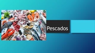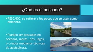 El documento clasifica los pescados en dos categorías: pescados blancos, que tienen un bajo contenido graso y son fáciles de digerir, como la merluza, el bacalao y la lubina; y pescados azules, que tienen un alto contenido graso superior al 6% y son migratorios, como el atún, el bonito y el salmón.