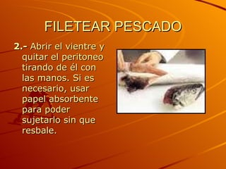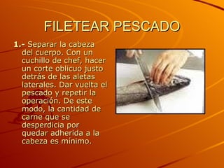 El documento proporciona 8 pasos para filetear un pescado de manera efectiva y minimizando las pérdidas de carne: 1) separar la cabeza del cuerpo haciendo cortes oblicuos detrás de las aletas, 2) abrir el vientre y quitar el peritoneo, 3) retirar la vejiga natatoria y sangre residual, 4) desprender el espinazo de la carne, 5) hacer incisiones a lo largo del pescado para separar los filetes, 6) retirar el filete superior y separarlo del es