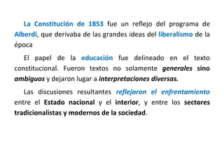 La educación en Argentina desde la conquista hasta el menemismo estuvo definida por las tensiones entre facciones liberales y conservadoras. Si bien la Constitución de 1853 estableció la educación como responsabilidad estatal, su implementación generó debates sobre el rol del estado nacional versus las provincias. Figuras como Sarmiento y Mitre buscaron construir un sistema escolarizado centralizado, aunque la Iglesia Católica también buscó mantener su influencia. El sistema educativo reflejó las luchas entre estas visiones, dejando déficit en la legisl
