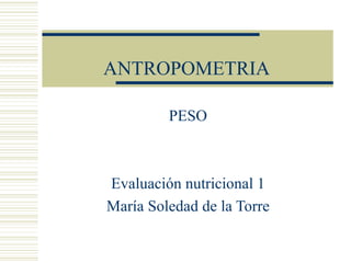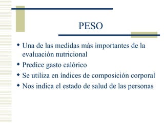 Este documento proporciona instrucciones sobre cómo pesar correctamente a pacientes de diferentes edades para evaluar su estado nutricional. Explica que el peso es una medida importante, cómo usar diferentes tipos de balanzas de manera adecuada, y los procedimientos específicos para pesar a infantes, niños, adultos y personas no ambulatorias. También cubre conceptos como variaciones normales de peso a lo largo del día y cómo graficar el peso de niños prematuros en las curvas de crecimiento ajustando por su edad gestacional.