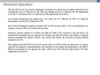 En 2012, Pesquera Exalmar reportó una captura efectiva de 3.3 millones de toneladas métricas, un 46% menos que en 2011, y generó ventas de US$ 217 millones, un aumento del 13% respecto al año anterior, impulsadas por mayores precios de aceite y aumento en ventas al consumidor directo. La utilidad neta fue de US$ 19.4 millones, inferior a los US$ 23.1 millones de 2011, con un margen bruto del 27%. La compañía también realizó un gasto de capital de US$ 49.3 millones, incluyendo actualizaciones en sus plantas y la emisión de bonos por US$ 200 millones.