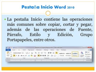 La pestaña Inicio de Word 2010 contiene herramientas para copiar, cortar y pegar texto, así como para aplicar formatos de fuente, párrafo y estilo. Incluye grupos para portapapeles, fuente, párrafo, estilo y edición, con opciones como cambiar el tamaño y color de fuente, agregar viñetas o numeración, alinear texto y aplicar estilos.