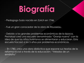 Pestalozzi fue un pedagogo suizo del siglo XVIII que creó escuelas para niños huérfanos y desarrolló un método de enseñanza basado en la intuición y la observación. Defendía la educación integral del niño y la importancia de la madre en la formación inicial. Escribió varias obras pedagógicas influyentes y desarrolló un centro de formación de profesores que aplicaba sus ideas durante 20 años.