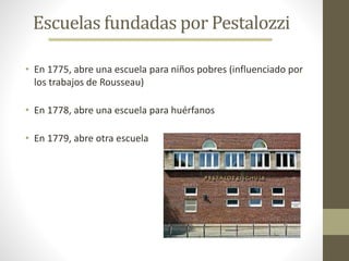 Pestalozzi abrió varias escuelas para niños pobres y huérfanos en la década de 1770 influenciado por las ideas de Rousseau. Creía que la educación debía partir de las observaciones, intereses y actividades de los niños en lugar de enseñarles conocimientos que no podían ver. Consideraba que la educación física es importante para la fortaleza corporal y que el papel del docente es ayudar a los niños en su desarrollo natural sin adelantarse artificialmente.
