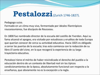 Pestalozzi fue un pedagogo suizo del siglo XVIII que desarrolló un método de enseñanza basado en la intuición y el desarrollo natural del niño. Dirigió una escuela en Yverdon que se hizo famosa en Europa por su innovador enfoque educativo. Más tarde escribió sobre su experiencia y difundió las ideas de una educación basada en el desarrollo de las capacidades individuales de cada niño.