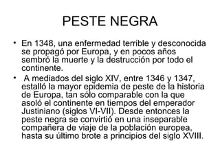 La peste negra asoló Europa entre 1346 y 1353, matando a aproximadamente a un tercio de la población europea. La enfermedad se propagó rápidamente a través del continente y se convirtió en una constante amenaza hasta el siglo XVIII. No fue hasta el siglo XIX que los científicos descubrieron que la bacteria Yersinia pestis, transmitida por pulgas de las ratas a los humanos, era la causa de la peste.