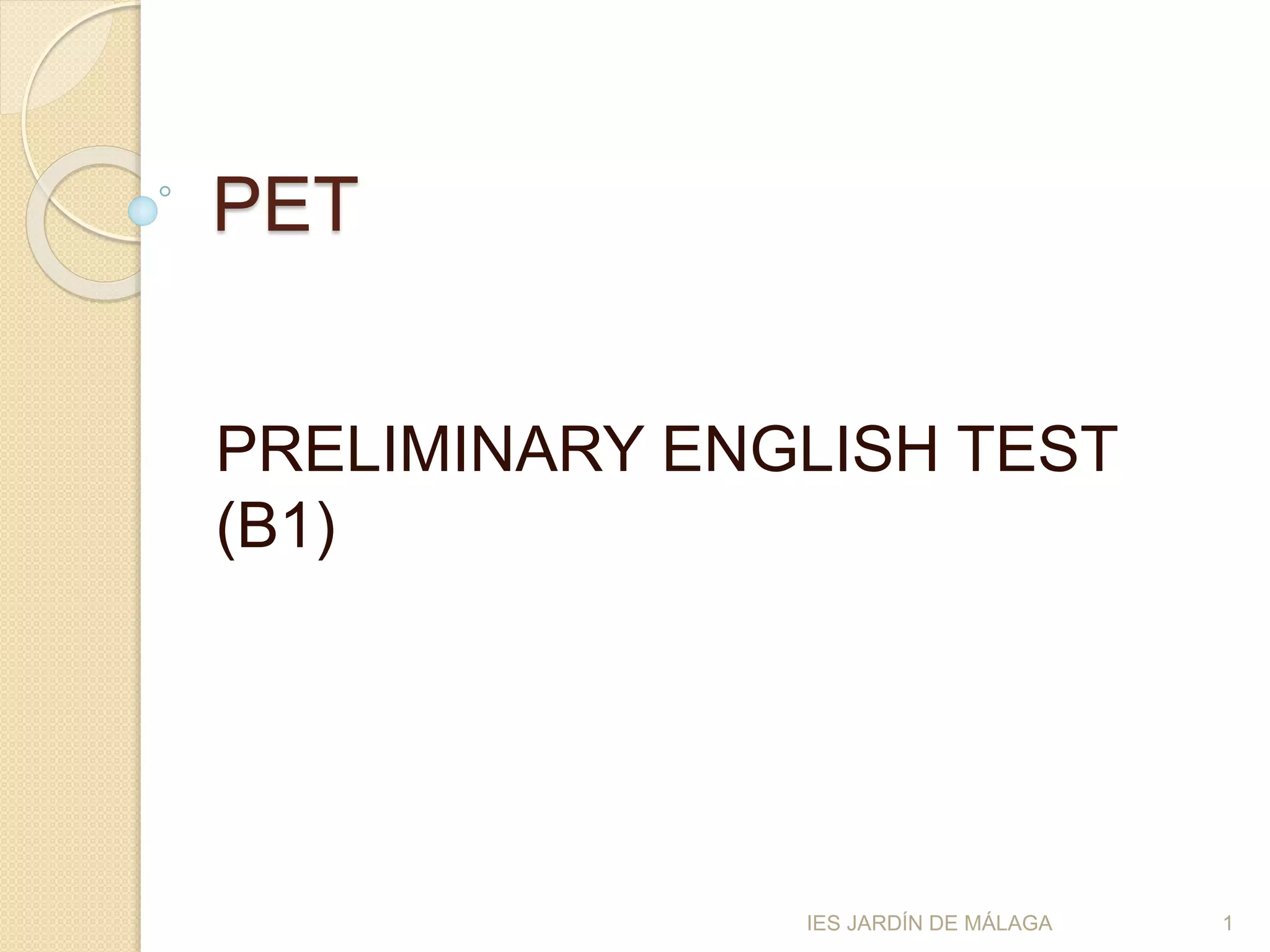 El documento proporciona información sobre el examen PET (Preliminary English Test) que mide el nivel B1 de inglés. Explica que consta de cuatro partes: Reading and Writing, Listening, Speaking y proporciona detalles sobre el formato y contenido de cada una.