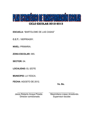 Este documento presenta información sobre el ciclo escolar 2012-2013 de la Escuela Primaria "Bartolomé de las Casas" ubicada en la comunidad de El Izote, municipio de La Yesca, Nayarit. Incluye detalles sobre la comunidad, características de la escuela, diagnóstico inicial, resultados del análisis de la gestión escolar y una autoevaluación del director sobre el trabajo educativo. El objetivo principal es mejorar los resultados de los alumnos mediante el fortalecimiento de la práctica docente y el desar
