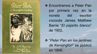 Peter Pan fue creado por el escritor escocés James Matthew Barrie, apareciendo por primera vez en su novela de 1902 "El pajarito blanco". La historia de Peter Pan se hizo popular a través de una obra de teatro de 1904 y una novela de 1911. Desde entonces, ha habido numerosas adaptaciones de la historia a películas, series de televisión y otros medios.