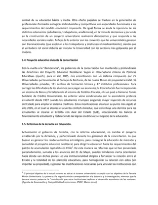El documento analiza el sistema educativo chileno desde la dictadura hasta la actualidad,