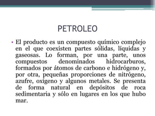 El documento describe brevemente el origen y composición del petróleo. El petróleo es un compuesto químico complejo formado principalmente por hidrocarburos de carbono e hidrógeno, así como pequeñas cantidades de nitrógeno, azufre y oxígeno. Se forma de restos de plantas y animales marinos enterrados en depósitos sedimentarios bajo la tierra, donde la ausencia de aire, alta presión y temperatura, y la acción de bacterias lo convierten en petróleo a lo largo de millones de años