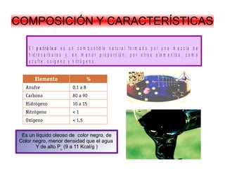 El petróleo es la principal fuente de energía primaria actual. Es un líquido oleoso de color negro formado por una mezcla de hidrocarburos que se origina de la transformación de plancton en condiciones de alta presión y temperatura bajo capas de sedimentos marinos. Se extrae de yacimientos subterráneos mediante perforación y bombeo y se refina para obtener combustibles líquidos y gaseosos como la gasolina y el gasóleo, usados como combustibles de transporte e industria y que generan problemas med