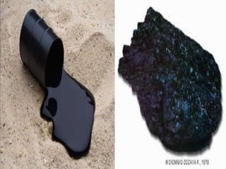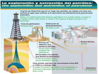 El documento describe el petróleo, incluyendo que se forma de la transformación de materia orgánica acumulada, es una mezcla de hidrocarburos y se encuentra en estado líquido normalmente. Se extrae mediante perforación de pozos y bombeo, y se transporta en buques tanques hasta las refinerías, donde se destila fraccionadamente para separarlo en mezclas más simples y obtener derivados como gasolina y aceites lubricantes.
