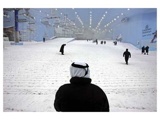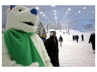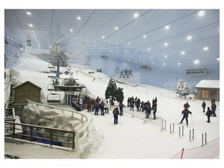 El documento describe la construcción de una obra de ingeniería impresionante en Dubái, Emiratos Árabes Unidos. Se construyó en medio del desierto con temperaturas de hasta 50 grados, lo que hizo que su construcción fuera un desafío. Una vez terminada, la obra muestra palmeras y detalles internos increíbles a pesar de estar ubicada en medio de un caluroso desierto.