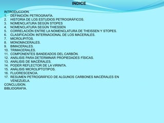 Este documento trata sobre petrografía, que estudia las rocas mediante observación microscópica. Explica conceptos como la historia de la petrografía, la nomenclatura de los componentes del carbón, clasificación de macerales, análisis para determinar propiedades físicas, y realiza un resumen petrográfico de carbones en Venezuela. La petrografía permite clasificar las rocas y establecer condiciones de formación a través del estudio de sus componentes a nivel microscópico.