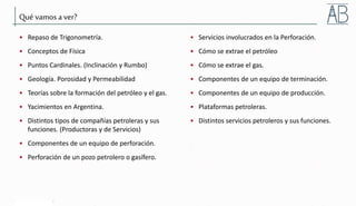 Este documento presenta un curso de operador auxiliar para la actividad hidrocarburífera. El curso cubre temas como trigonometría, física, geología, formación de petróleo y gas, tipos de yacimientos y compañías petroleras, perforación de pozos, extracción de petróleo y gas, equipos de terminación y producción, y servicios petroleros. También explica conceptos como torque, arrastre, fricción, tensión, compresión y coordenadas polares y rectangulares para describir la posición de